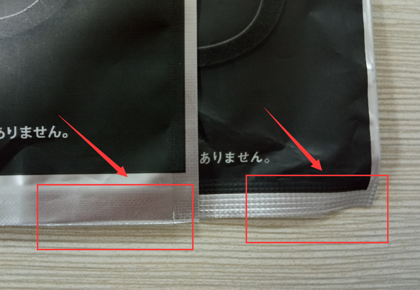 正品:自封口邊緣壓邊面積小幾乎沒有壓邊;包裝袋側(cè)邊封邊采用熱切法,邊緣幾乎無壓邊。