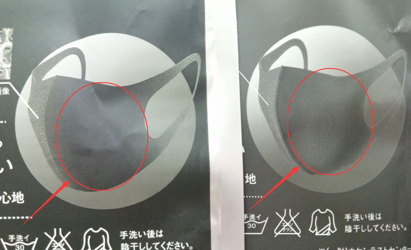 仿品口罩圖案是很粗糙,為了仿造海綿質(zhì)感做出來的效果反而有一種顆粒感。